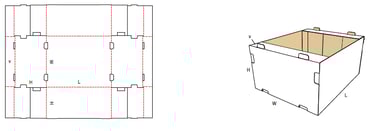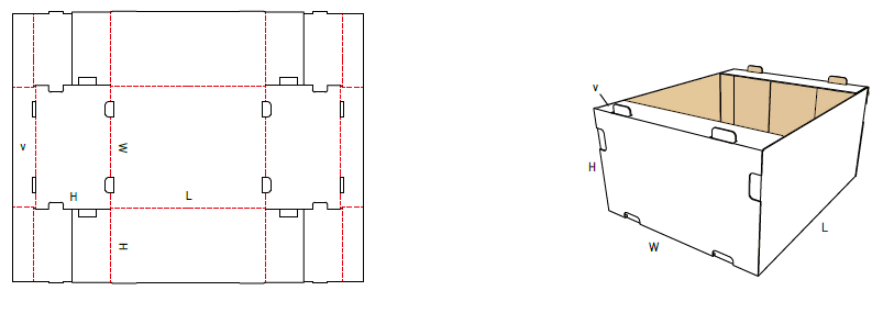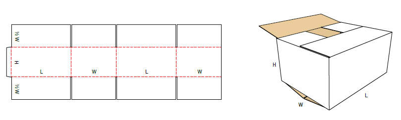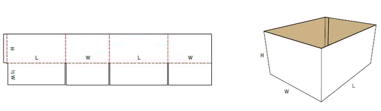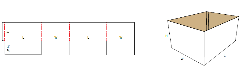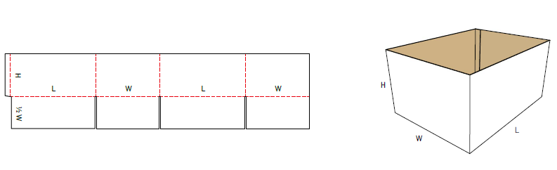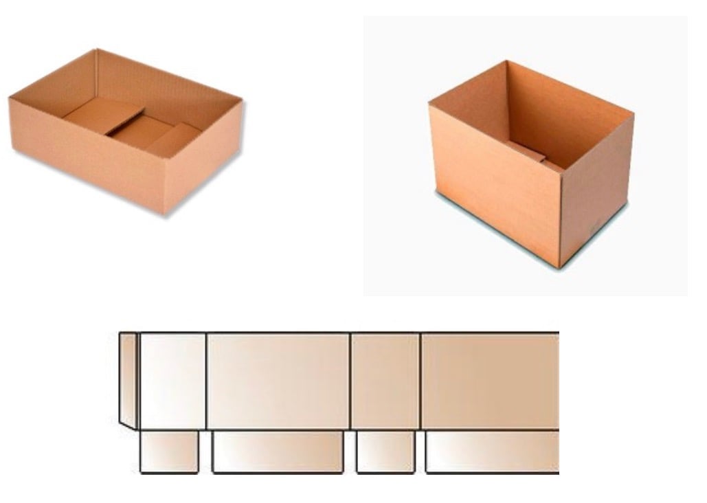 Esta caja se puede cerrar solo desde la parte inferior, sirve como una caja de visualización, ya que no tiene solapas en la parte superior, se puede hacer con una bandeja o tapa auto ensamblada para usarla como una lima muerta. La fabricación se adapta a las necesidades del cliente: "largo X ancho X alto", con o sin impresión. Presentación del cartón: corrugado simple, corrugado doble..
